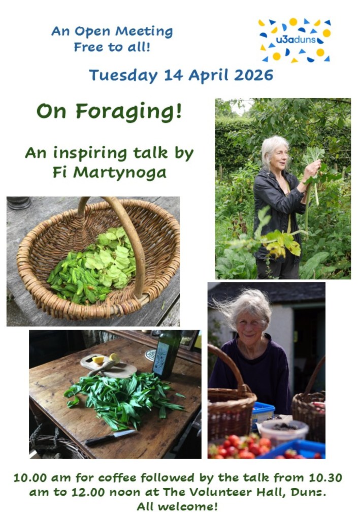 In 2005, eager to find a way of protesting about the poverty of the contemporary Scot’s Diet, Fiona Martynoga decided to spend a year living the life of a late eighteenth-century ancestor. She wrote about it month by month for The Herald and subsequently published The Garden Cottage Diaries which gives a full account of living from her garden, with foraged and bartered things, but without electricity or running water. Many of you will remember her fascinating talk about the experience that she gave to Duns and District u3a on 3 October 2023. This time, she returns to talk about foraging: an important topic as winter turns into spring and with all the temptations and treats of summer and autumn ahead of us. Hopefully we will be energised to go out exploring the wealth and beauty of the countryside!